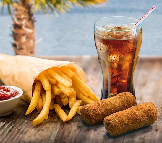 Heb je lekkere trek? Kies dan voor ons snackpakket. Voor een klein bedrag krijg je een snack (frikadel, kroket, kipcorn of bami), een grote puntzak verse frites met mayonaise of curry en een blikje frisdrank naar keuze.